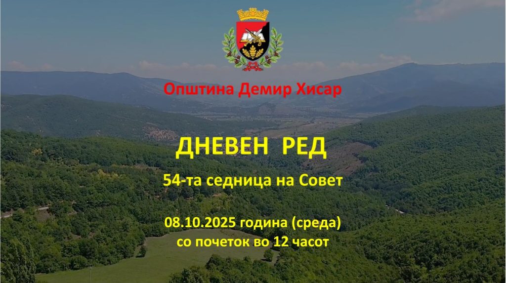 Врз основа на член 53 од Деловникот за работа на Советот на Општина Демир Хисар („Службен гласник на Општина Демир Хисар “ бр.3/02) донесувам Р Е Ш Е Н И Е за свикување 54-та седница на Совет на Општина Демир Хисар Седницата ќе се одржи на 08.10.2025 година (среда) со почеток во 12 часот во […]