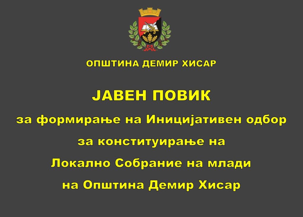 Врз основа на член 17 од Законот за младинско учество и младински политики („Сл. весник на РСМ” бр. 10/20) и член 82г од Статутот на Општина Демир Хисар (Службен гласник на Општина Демир Хисар бр.5/02, 4/05, 7/09, 16/13, 18/1410/19, 7/21 и 21/23), Општина Демир Хисар распишува ЈАВЕН ПОВИК за формирање на Иницијативен одбор за конституирање […]